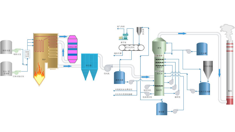 锅炉烟气经SCR/SNCR组合脱硝后,进入除尘器,经湿法脱硫和深度除尘...