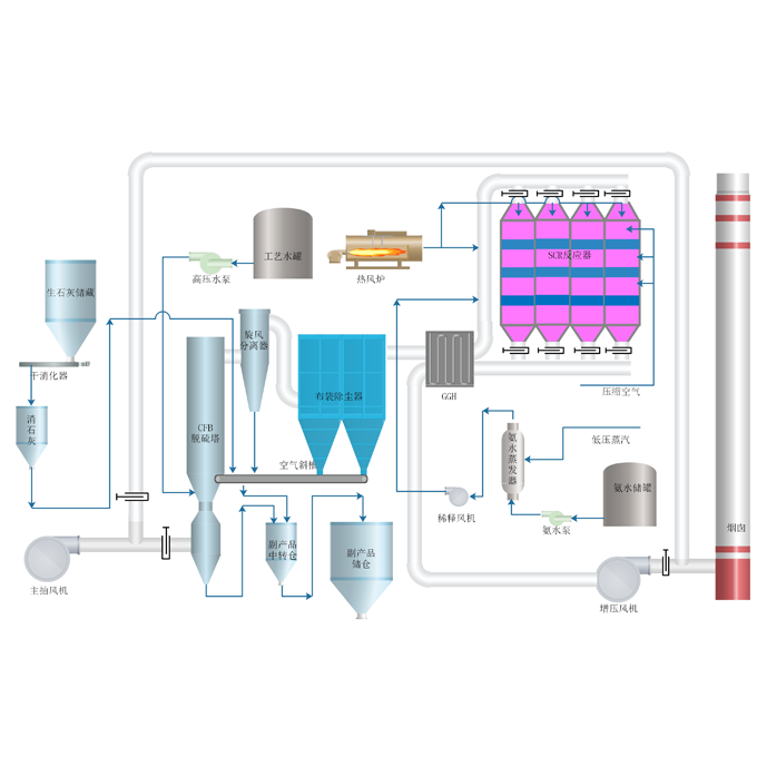 该技术路线为先脱硫后脱硝,烟气烧结机出口烟气通过电除尘、湿法脱硫、冷凝除尘除雾装置(或湿式电除尘)进入冷凝和MGGH系统,然后再进入GGH换热升温,再将此烟气通过高炉煤气燃烧器进行补燃,加热到活性温度,然后进入脱硝SCR反应器,完成预定的脱硝过程,脱硝后的烟气再次进入GGH,将热量传递给刚开始的低温烟气。脱硝后的烟气经过GGH出口温度不小于100℃,高于烟气露点20℃左右,以防烟囱雨及大白烟拖尾现象。净烟气通过引风机排至烟囱。