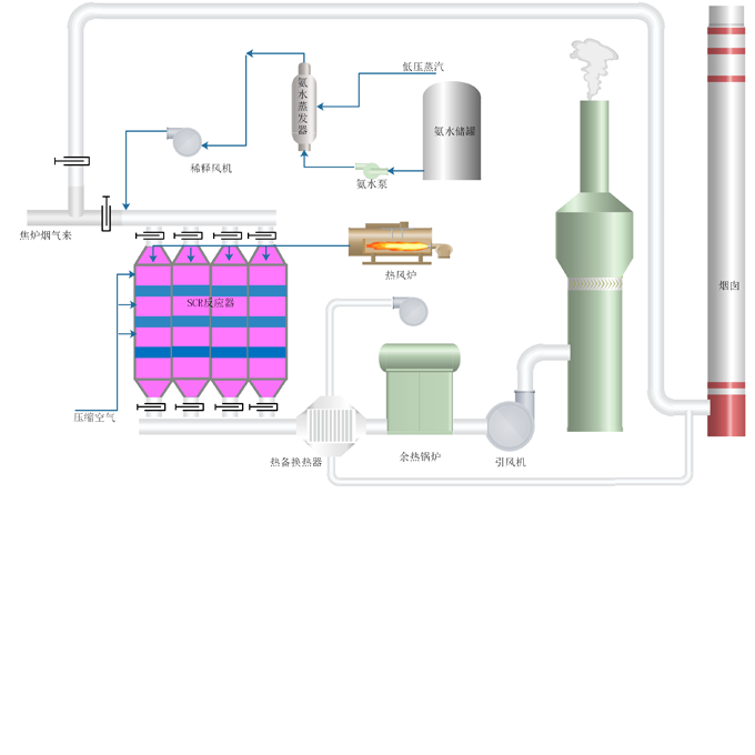 该技术路线为先脱硝后脱硫,集成了SCR中低温脱硝、余热利用及湿法脱硫技术于一体,并将环境空气与烟道气进行换热,得到的热空气返回原烟囱,对原烟囱进行热备(保持原烟囱的持续吸力)。